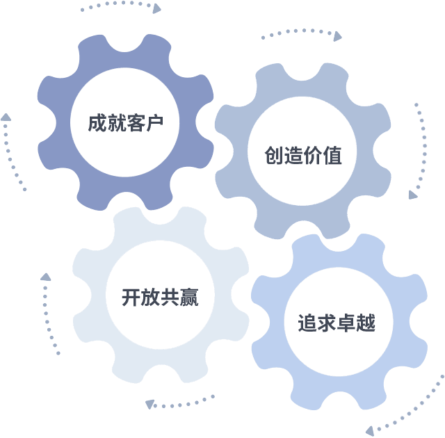 成就客户是一切决策的出发点,,,,创造价值是衡量所有工作的标准,,追求卓越是金年会金字招牌诚信至上做事做人的态度,,,开放共赢是金年会金字招牌诚信至上的格局也是最终的结果。。。。价值观的齿轮环环相扣,,推动着组织里的每个人不断向前。。